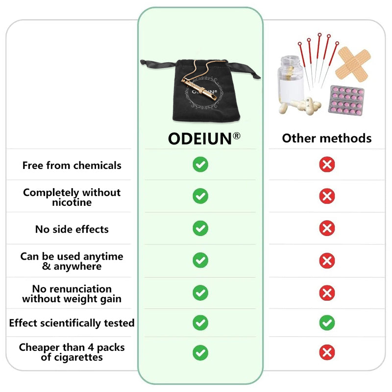 Conventional methods such as nicotine patches, acupuncture, hypnosis or medication quickly become very expensive and time-consuming. With ODEIUN you can enjoy the most affordable method of saying goodbye to smoking. Worry-free, simple and effective!